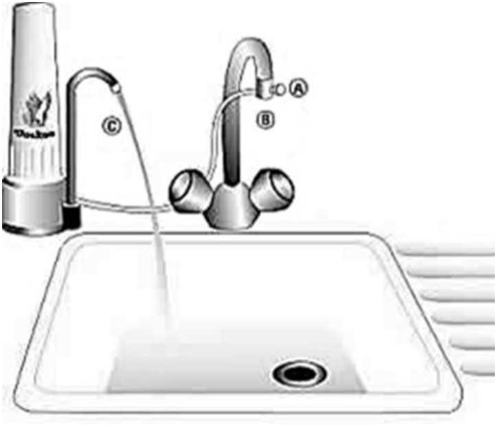 Tire de la perilla de la válvula derivadora (A) y el agua cruda pasará a través del filtro y saldrá pura por el pico vertedero (C).